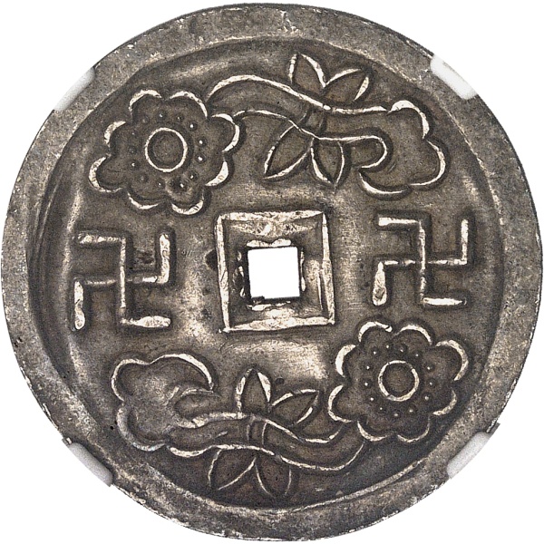 Rv. Le sceptre nhu’ y (à vos souhaits) deux fois répétés, accompagnés de deux caractères van swastika (dix mille).