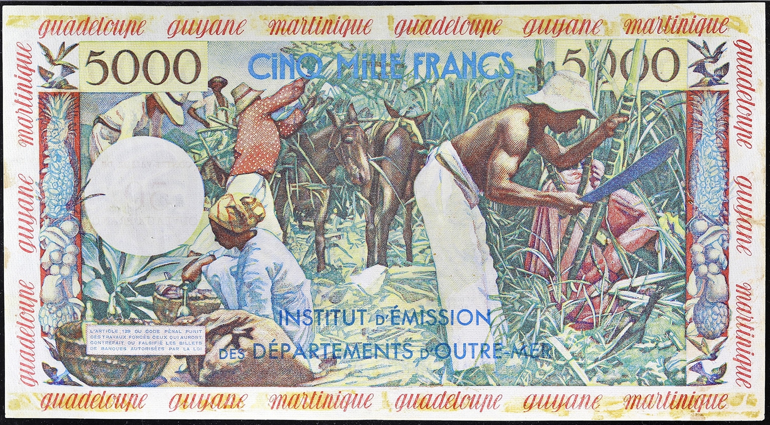 50 nouveaux francs surchargé sur 5000 francs type “jeune antillaise” ND (1960).