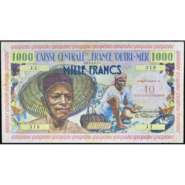 C’est le second plus haut grade ! Alphabet J.1 - numéro 318, c’est la première fois qu’un exemplaire est proposé pour la première série “1” et en lettre J, le 8318 ème billet émis ! Type très rare et recherché en particulier pour la Guyane. À noter, le portrait d’un pêcheur antillais sur le côté gauche au recto du billet et la surcharge “contre-valeur de 10 nouveaux francs “ en rouge au niveau du filigrane sur le côté droit. A noter, seulement 5 autres exemplaires référencés dans la base de population PMG (Top pop : PMG 30).