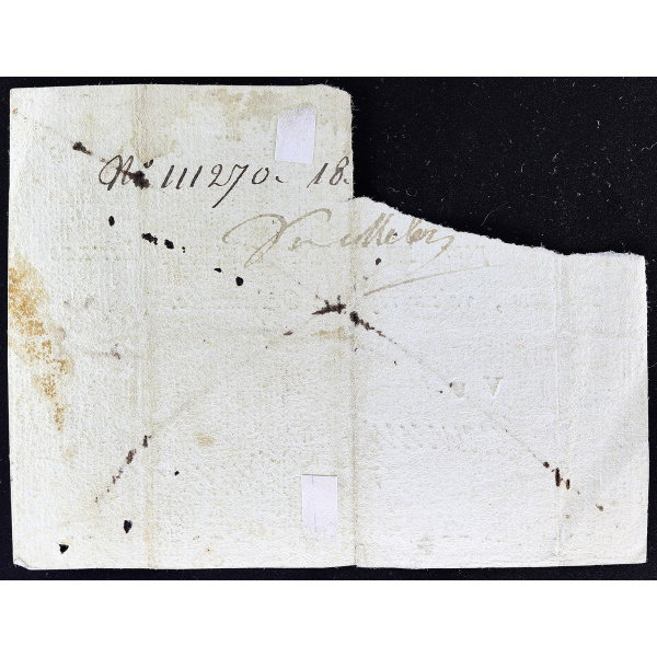Pas de série, mais numéro manuscrit sur la partie manquante en haut à gauche et avec 3 signatures à la griffe et manuscrite avec Foucault / Levasseur / Hulot. Ce type est tout simplement une pièce de musée, car jamais retrouvé et non référencé à ce jour. Au recto, le billet présente également deux traits noirs d’annulation en diagonale visée par De Curt. Au verso, on retrouve le visa de Melon avec le numéro 111270 et la date du 18 XX, le reste sur la partie manquante.