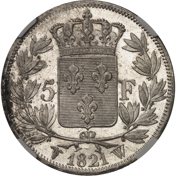 Louis XVIII (1814-1824). 5 francs buste nu 1821, W, Lille.