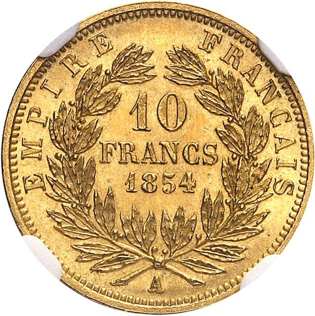 - Second Empire / Napoléon III (1852-1870). 10 francs tête nue, petit module, tranche lisse 1854, A, Paris.