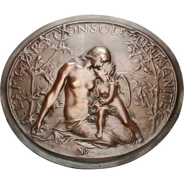 - IIIe République (1870-1940). Fonte uniface, l’Amour console l’Humanité, par O. Roty ND (1899), Paris.