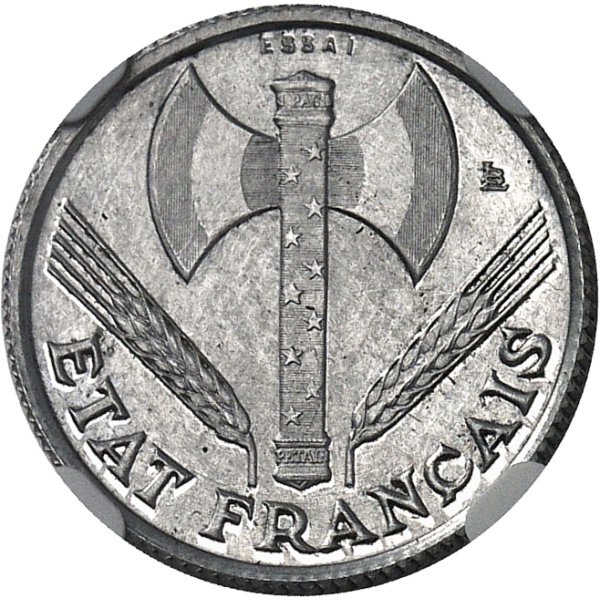 Rv. ETAT FRANÇAIS. Une francisque entre deux épis ; monogramme LB et ESSAI en haut.