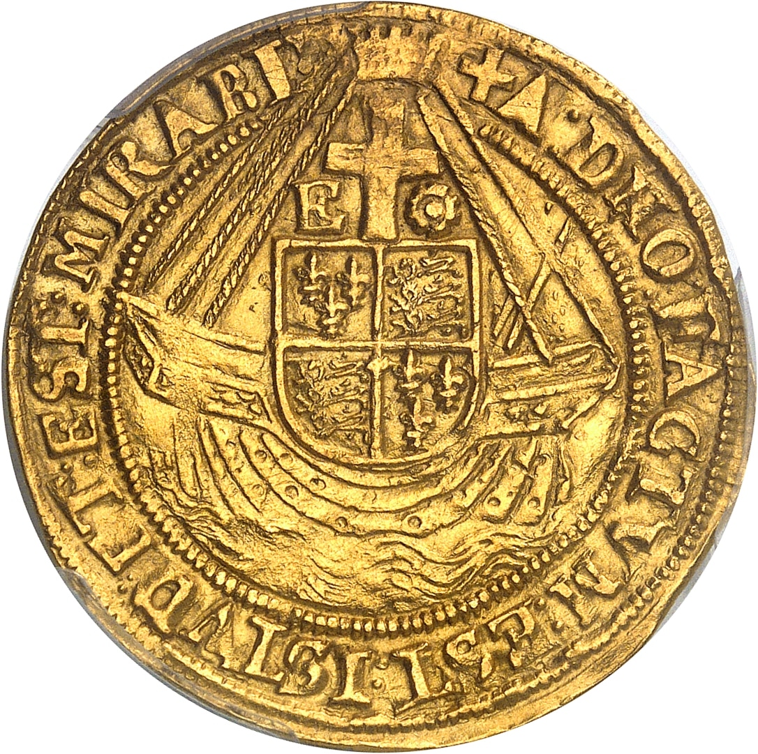 Rv. (différent) A: DNO: FACTVM: EST: ISTVD: ET: EST: MIRABI. Écu écartelé de France et d’Angleterre sur une nef ; une croix sur le mât, accostée d’un E et d’une rose.