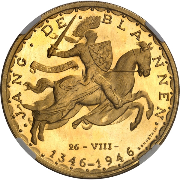 Rv. JANG. DE. BLANNEN. Le Roi Jean Ier de Bohême armé, à cheval à droite, avec banderole inscrite SERVIAM ; au-dessous, 26 - VIII 1346-1946 et signature BONNETAIN.