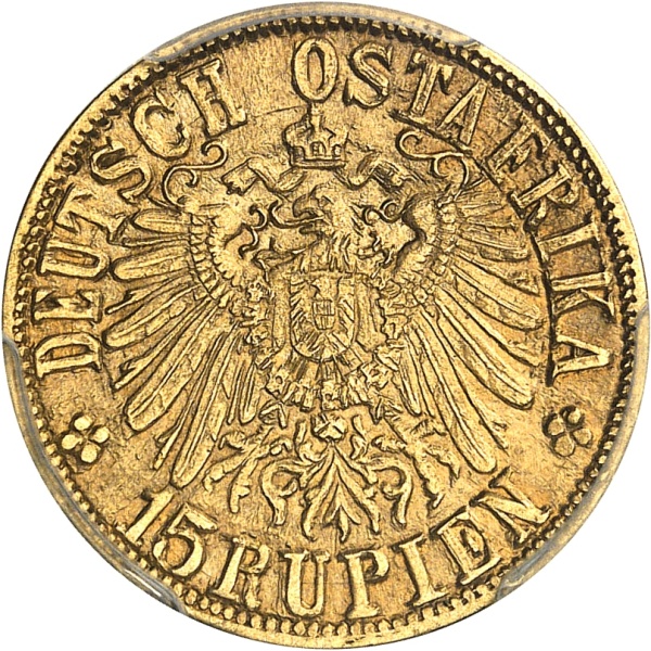 Rv. * DEUTSCH OSTAFRIKA / 15 RUPIEN. Aigle impériale éployée et couronnée.