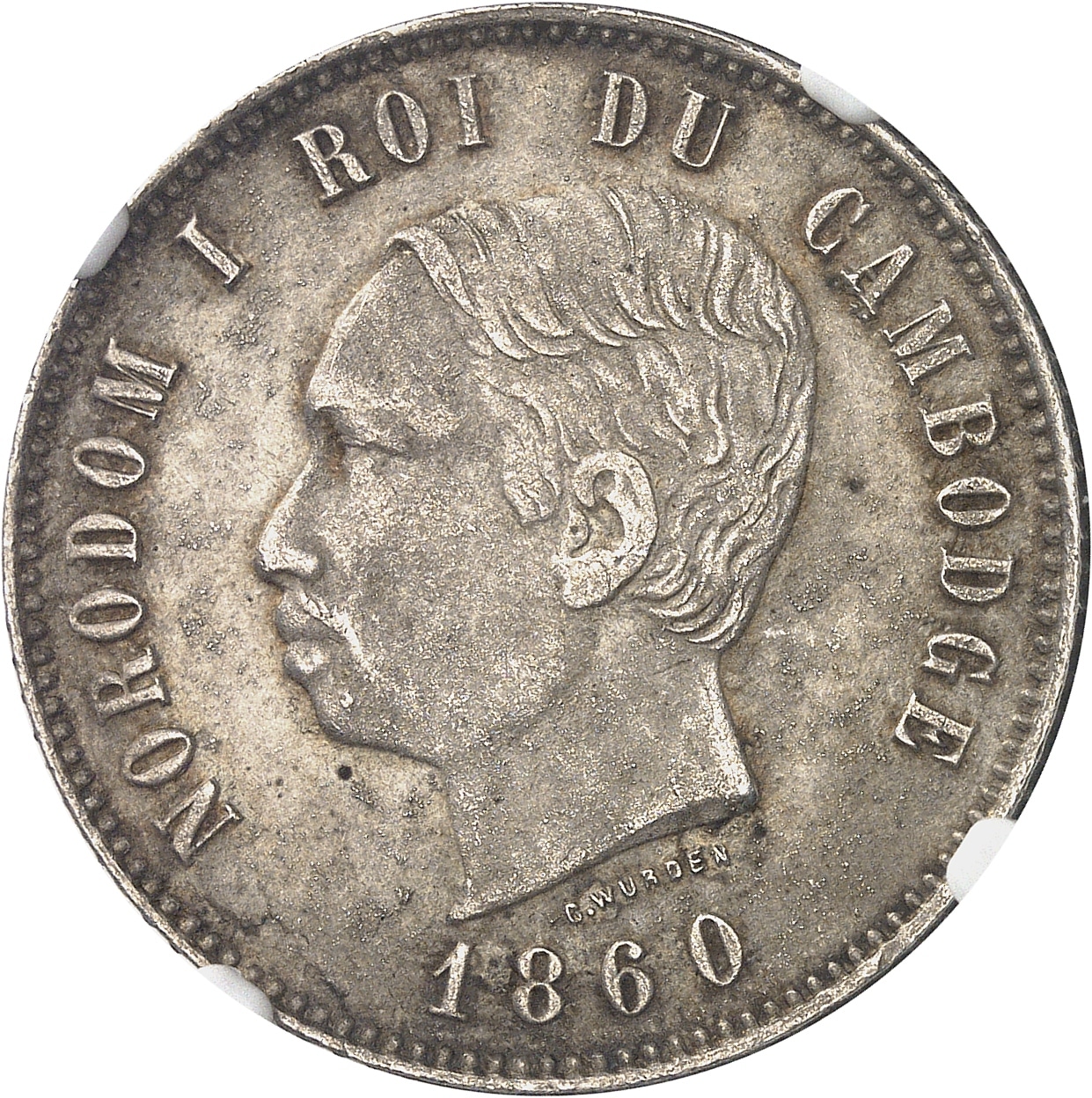 Les frappes au nom de Norodom furent réalisées à partir de 1875 dans l’atelier de Charles Würden à Bruxelles, et datées 1860. Les coins furent ensuite cédés au Roi Norodom qui les fit utiliser dans l’atelier de Phnom Penh, jusqu’à usure des coins. Ces monnaies ne furent jamais mises en circulation mais elles furent distribuées par le souverain lors des événements