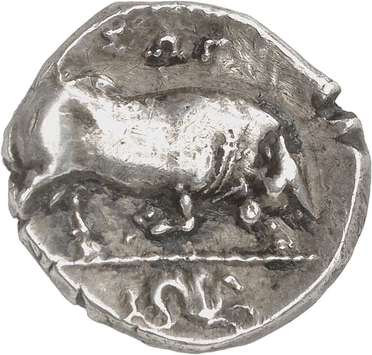 Rv. ΘΟΥΡΙΩΝ. Taureau marchant à droite, la tête baissée ; au-dessous un hippocampe à droite et au-dessus légende ΣΩΓ.
