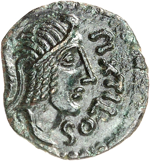 Av. Tête masculine (casquée ?) à droite, avec un cimier et des mèches enroulées retombant verticalement sur le cou ; légende PIXTILOS devant le visage ; un annelet sous la base du cou et un autre derrière le cimier.