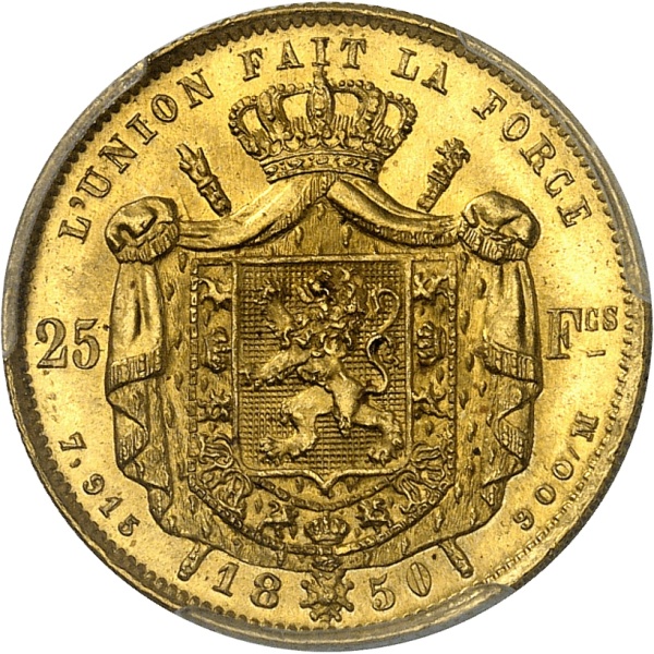 Rv. L'UNION FAIT LA FORCE. Sur un manteau couronné, les armes de Belgique, accostées de 25 - F., au-dessous 7,915 (date) 900/M.