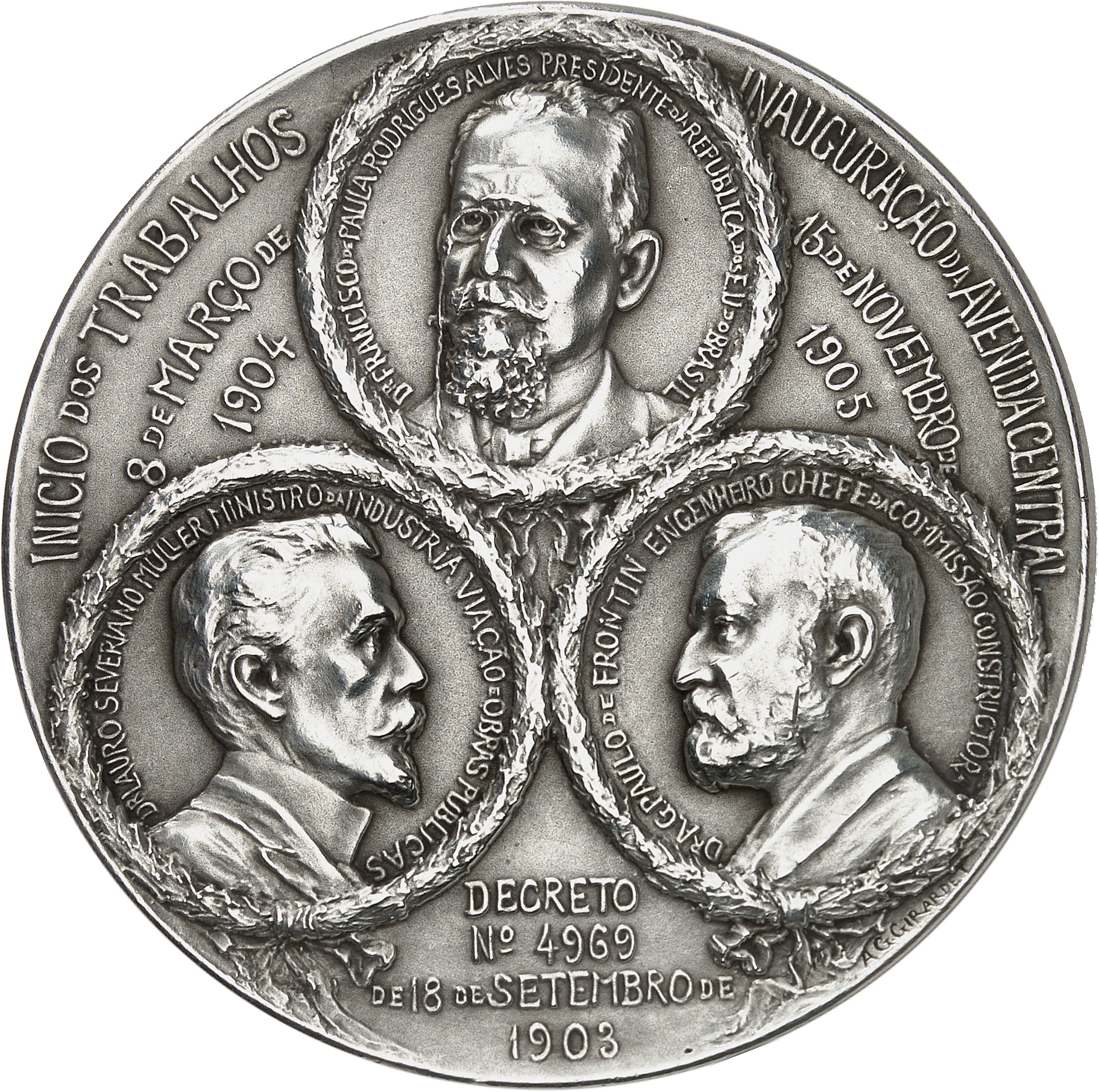 Av. INICIO DOS TRABALHOS - INAUGURAÇAO DA AVENIDA CENTRAL / DECRETO N° 4969 DE 18 DE SETEMBRO DE 1903 / 8 de MARÇO 1904 / 15 DE NOVEMBRO DE 1905. Bustes du Président de la République du Brésil Dr FRANCISCO DE PAULA RODRIGUES ALVES, du ministre de l’industrie et des travaux publics Dr LAURO SEVERIANO MÜLLER et de l’ingénieur en chef des travaux Dr A. G. PAULO DE FRONTIN.