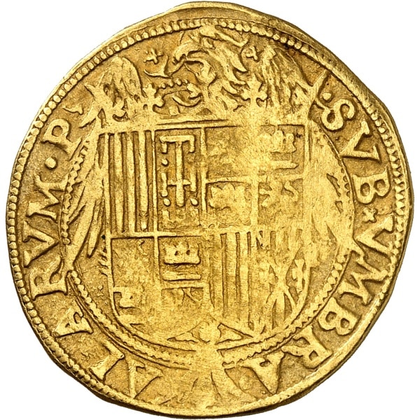 Rv. x - ·SVBx VMBRA· - ALARVM· P - x. Écu couronné aux armes des Rois catholiques. Derrière, l’aigle de Saint Jean.