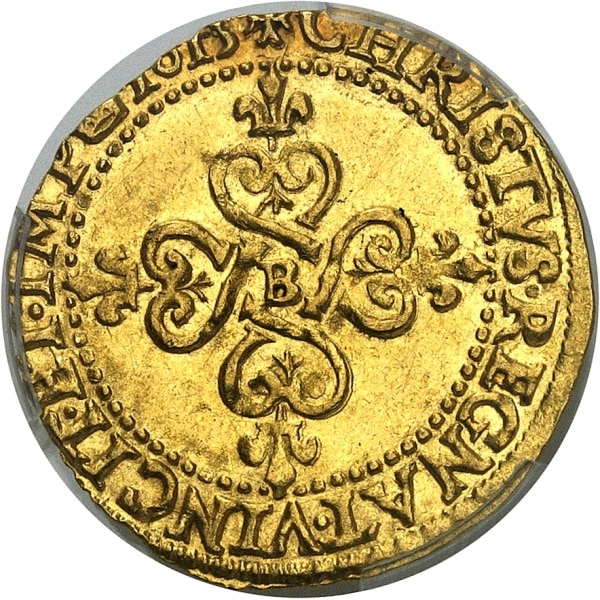 Rv. + CHRISTVS. REGNAT. VINCIT. ET. IMP (différent) (date). Croix anillée fleurdelisée avec (atelier) en cœur.