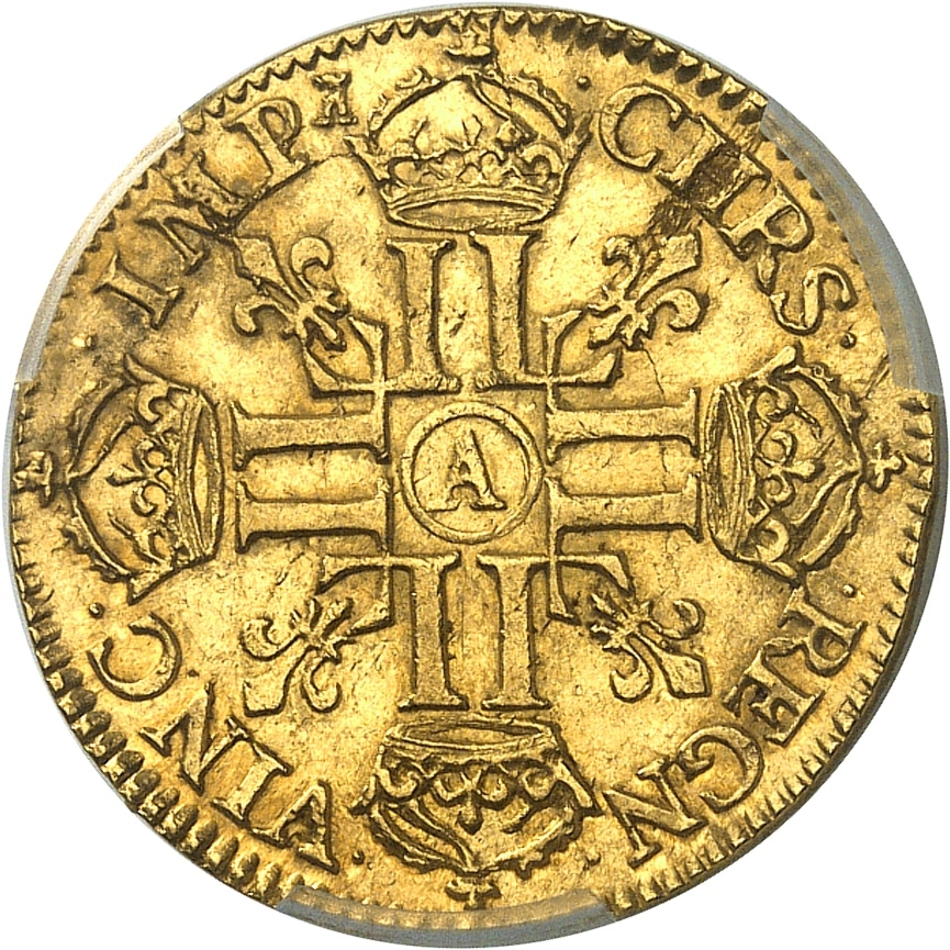 Rv. .CHRS. - .REGN. - .VINC. - .IMP (différent). Croix formée de huit L adossées, chaque bras étant couronné, avec (atelier) en cœur, cantonnée de quatre lis divergeant du centre.