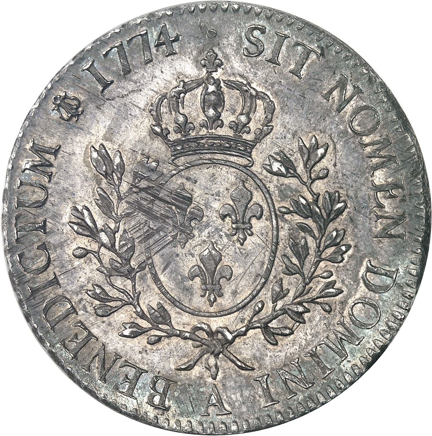Rv. SIT. NOMEN. DOMINI - BENEDICTUM (différent) (date). Écu de France ovale, couronné, entre deux rameaux d’olivier ; au-dessous (atelier).