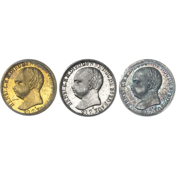 - Henri V (1820-1883). Ensemble de trois médaillettes en platine, or et argent, naissance du duc de Bordeaux ND (1820), Paris (Degen éditeur).