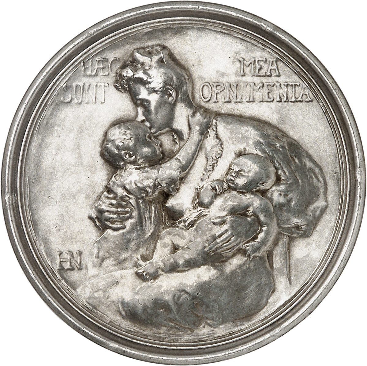 Av. HÆC SUNT MEA ORNEMANTA. Une femme à mi-corps, le sein dénudé, venant d'allaiter un nouveau-né repu, et embrassant un enfant sur le front ; signature HN en monogramme.