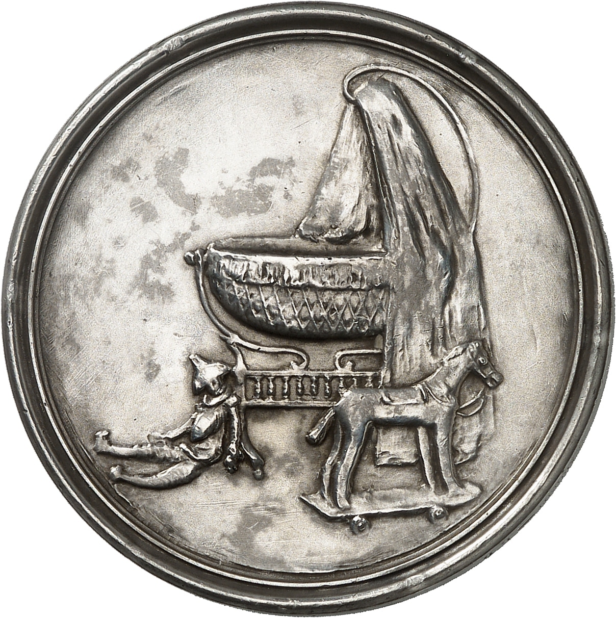 Rv. Un berceau avec un polichinelle et un cheval à roulettes.