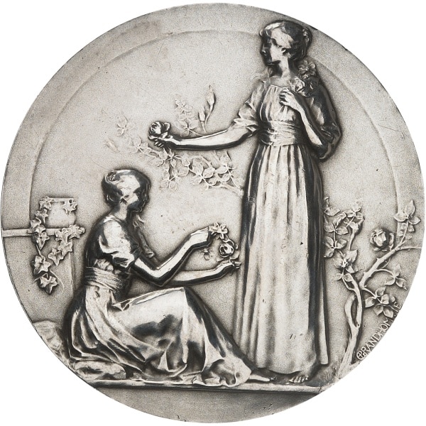 Rv. Deux femmes, l’une assise à droite et l’autre debout, à gauche, tenant des roses ; signature P GRANDHOMME.