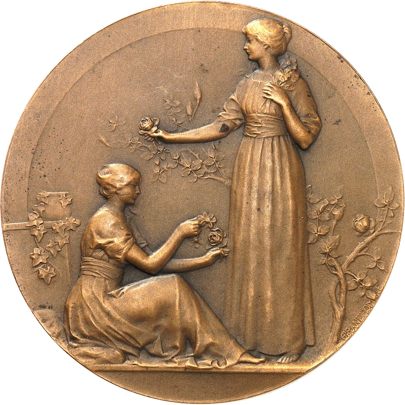 Rv. Deux femmes, l’une assise à droite et l’autre debout, à gauche, tenant des roses ; signature P GRANDHOMME.