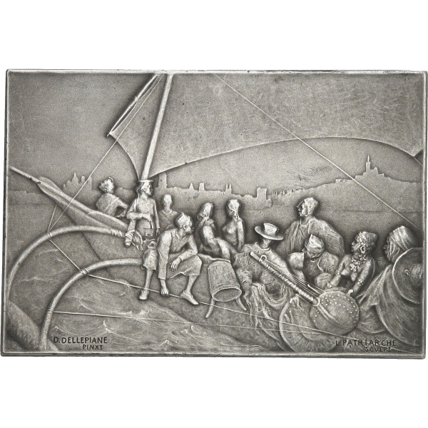 Av. Barque de pêcheurs avec douze hommes et femmes des colonies tenant parfois des instruments de musique, au-devant de la ville de Marseille ; signature D. DELLEPIAN/ PINXT et L. PATRIARCHE/ SCVLPT.