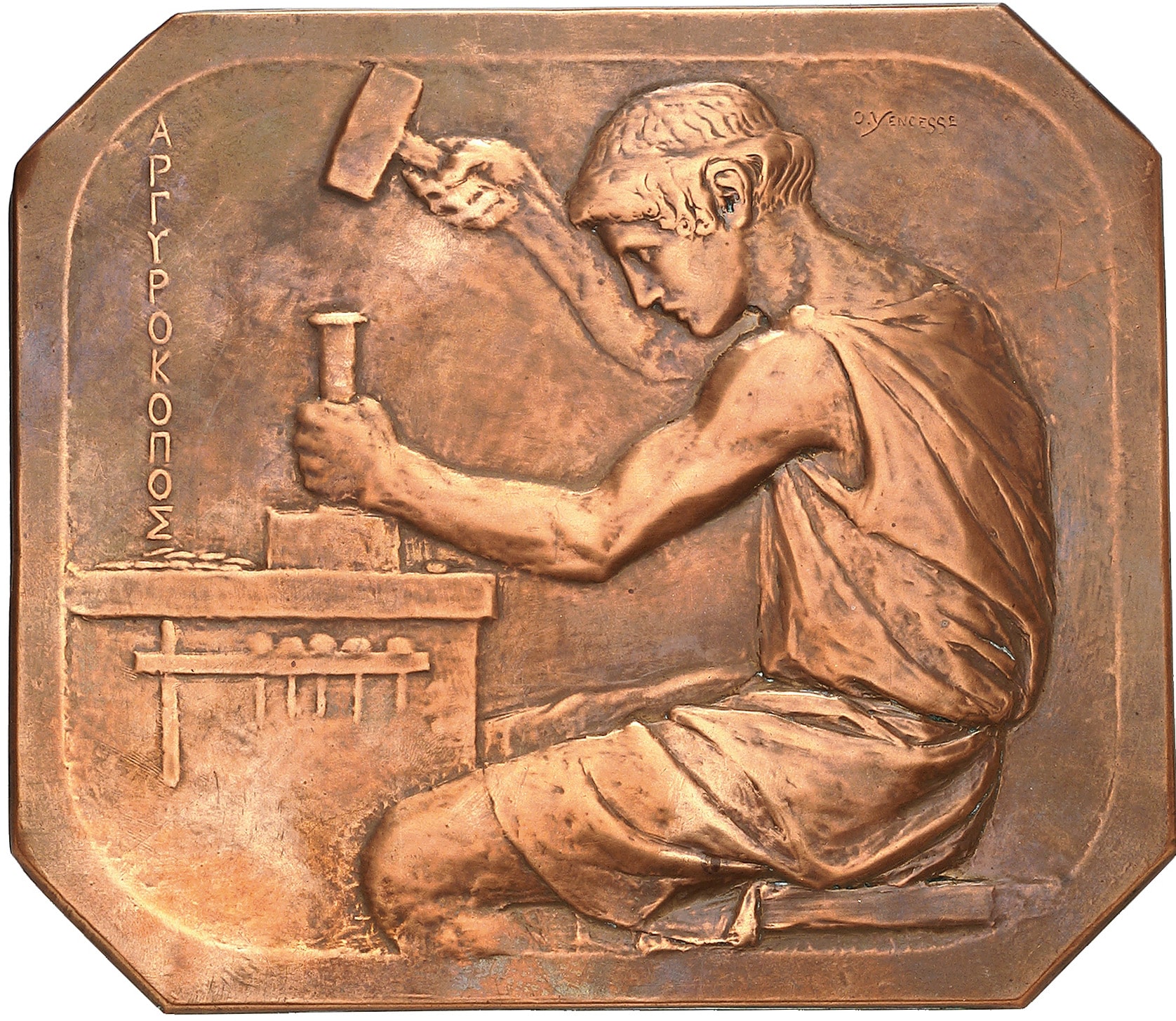Av. ΑΡΓΥΡΟΚΟΠΟΣ [L’orfèvre]. Un jeune homme habillé à l'antique, assis à gauche, frappe une monnaie au marteau ; signature O. YENCESSE.