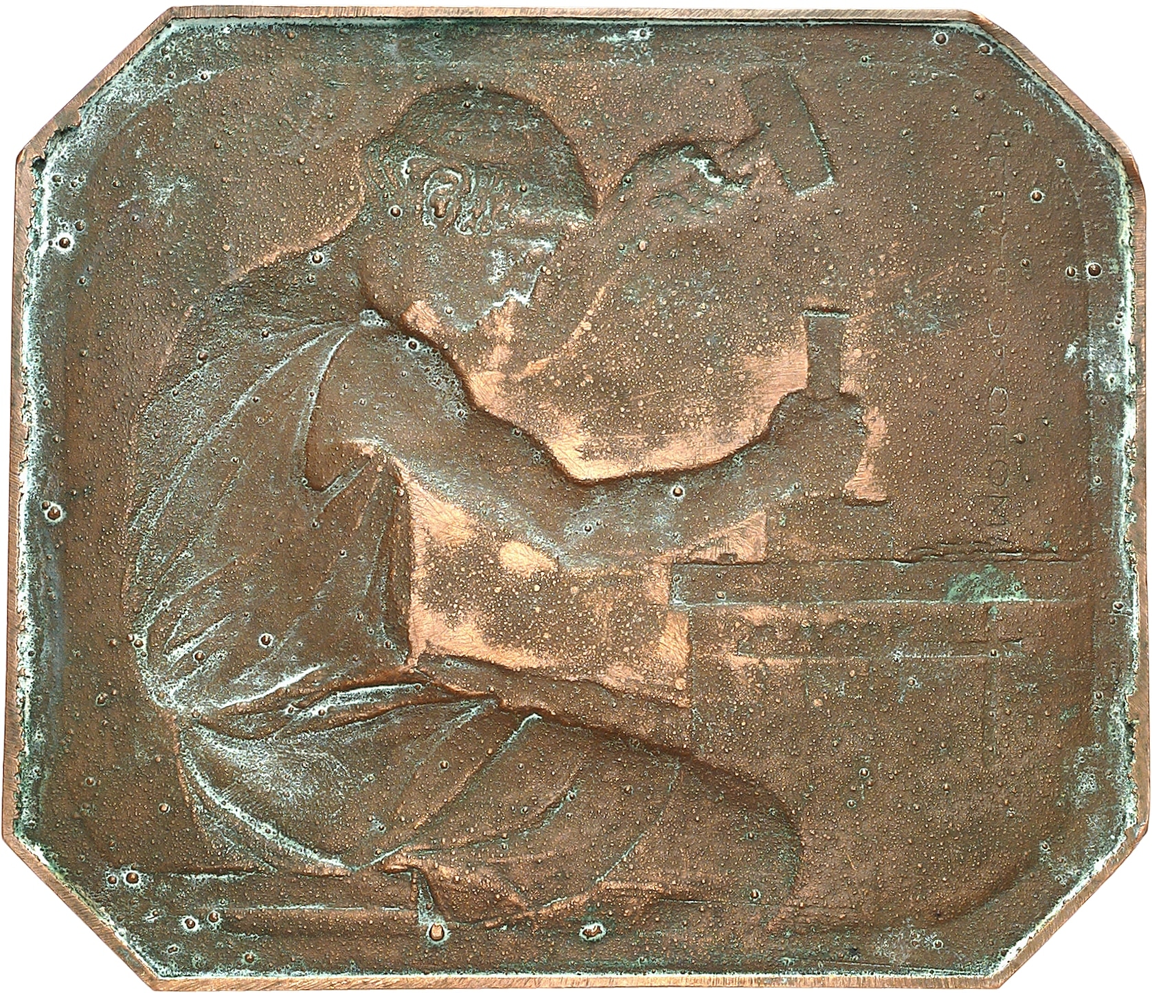 Cette galvanotypie a été réduite 2,5 fois pour figurer à l’avers de la plaquette de la maison Janvier et Duval (1902-1919), et sera à nouveau utilisée pour la maison Janvier et Berchot, nouvelle raison sociale dès 1919
