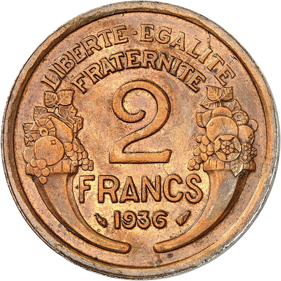 - IIIe République (1870-1940). Épreuve de 2 francs Morlon trimétallique, avers plaqué en cupro-nickel 1936, Paris.