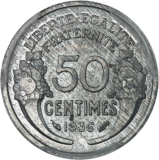 - IIIe République (1870-1940). Épreuve de 50 centimes Morlon en aluminium 1936, Paris.