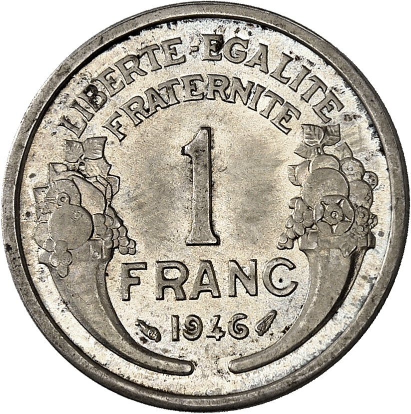 - Gouvernement provisoire de la République française (1944-1946). Épreuve de 1 franc Morlon en argent, de poids léger, Frappe spéciale (SP) 1946, Paris.