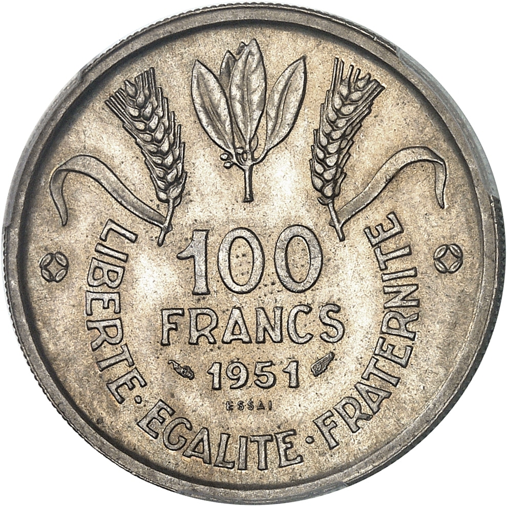 - IVe République (1947-1958). Essai de 100 francs grand module par G. Guiraud, Frappe spéciale (SP) 1951, Paris.