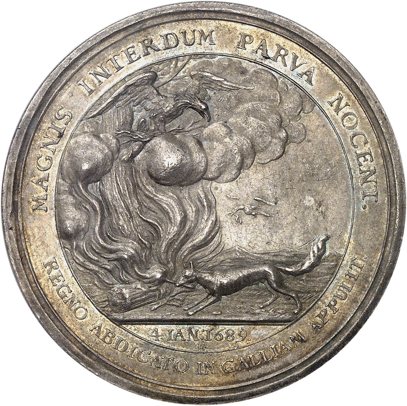 Rv. MAGNIS INTERDUM PARVA NOCENT. / REGNO ABDICATO IN GALLIAM APPULIT. Une renarde apportant dans sa gueule une torche au pied d’un arbre en feu, dans lequel niche un aigle et son petit. Au loin, un aigle en vol avec un renardeau dans son bec. À l’exergue : 4. IAN: 1689 et (signature).