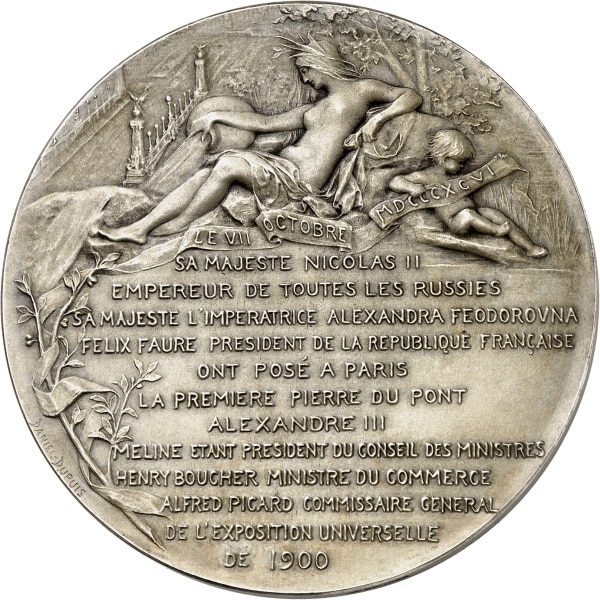 Av. ALEXANDRE III / PAX. Sous une allégorie montrant le buste rayonnant d'Alexandre III, la France et la Russie, personnifiées, en train de poser la première pierre du pont consacré à Alexandre III à Paris ; signature DANIEL-DUPUIS ; à l'exergue inscription en quatre lignes SVR LA BERGE HISTORIQVE AVANT QVE DE DESCENDRE/ SI TON GENEREVX CŒVR AVX CŒURS FRANÇAIS REPOND,/ MEDITE GRAVEMENT, REVE DEVANT CE PONT,/ LA FRANCE LE CONSACRE A TON PERE ALEXANDRE.