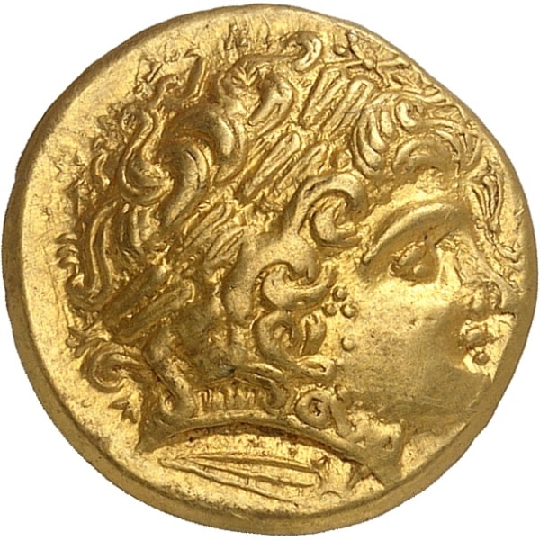 Av. Profil apollinien lauré à droite, aux boucles de cheveux entremêlées, trois points sur l’oreille ; un glaive, la pointe à gauche, sous le cou.