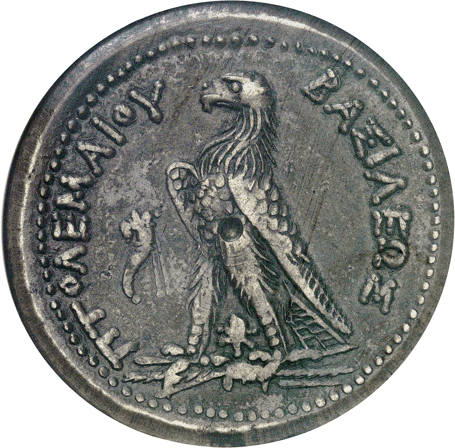 Rv. BAΣIΛEΩΣ ΠTOΛEMAIOY. Aigle debout à gauche sur un foudre, corne d’abondance à gauche, monogramme (chi-rho) entre ses pattes.