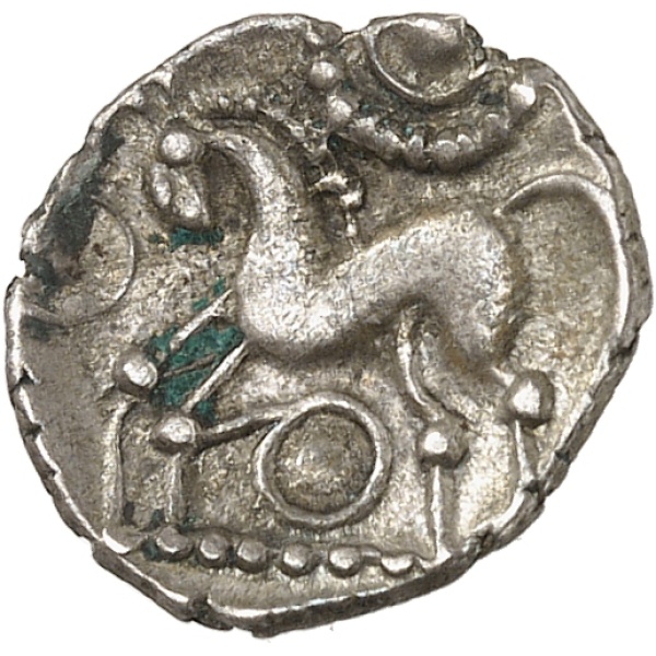 Rv. Cheval à gauche un annelet pointé entre les jambes et un autre entouré d'un annelet perlé au-dessus du dos.