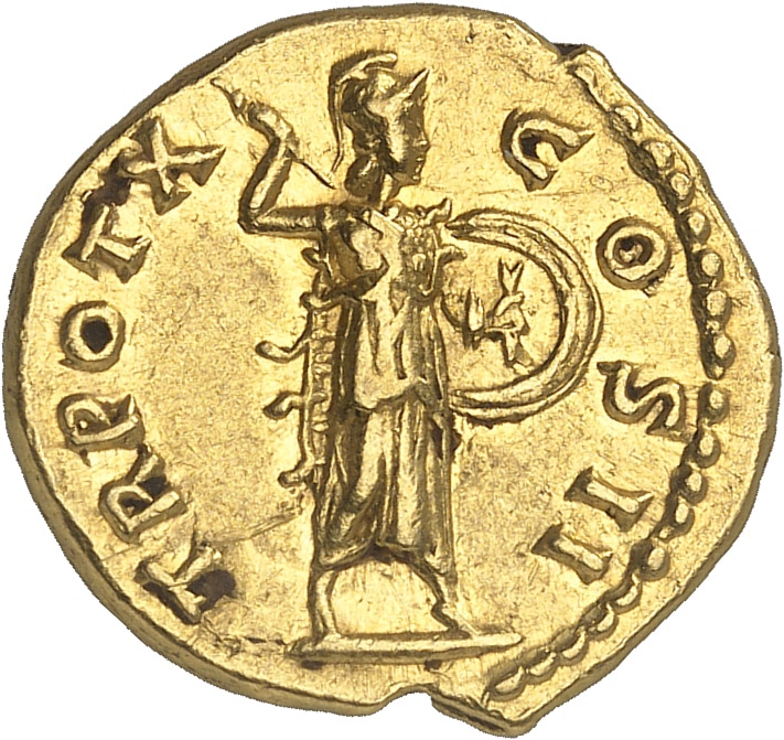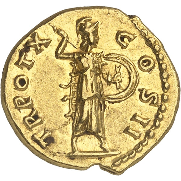 Rv. TR POT X - COS II. Minerve à droite tenant un bouclier et brandissant une lance.
