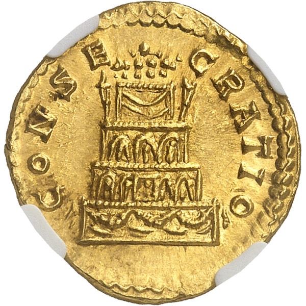 Frappe sous l’Empereur Commode. Marc Aurèle meurt le 17 mars 180 dans ses quartiers militaires près de Sirmium en Pannonie, probablement de la peste. Il a été immédiatement déifié et ses cendres ont été envoyées à Rome pour reposer dans le Mausolée d’Hadrien. Son bûcher funéraire est représenté au revers de notre aureus. Un podium formait le premier étage. Au deuxième étage, une chambre dans laquelle était placée le corps de l’Empereur, était fermée par des portes visibles sur notre exemplaire. Les deux étages supérieurs étaient décorés de niches et de statues. Enfin, une effigie monumentale en cire de l’Empereur conduisant un quadrige triomphal se trouvait au sommet. Lors de la crémation, un aigle sortait pour symboliser l’âme de l’Empereur prenant sa place parmi les Dieux dans les cieux Découvrir cette pièce en vidéo * Following Council Directive (EU) 2022/542 of April 5, 2022, implemented in national law from 01/01/2025, buyers from within the EU have to pay 5.5% VAT on the hammer price of this lot. * Suite à la Directive (UE) 2022/542 du Conseil du 5 avril 2022, mise en application dans le droit national à compter du 01/01/2025, l’adjudicataire européen devra également payer une TVA de 5,5% sur ce lot