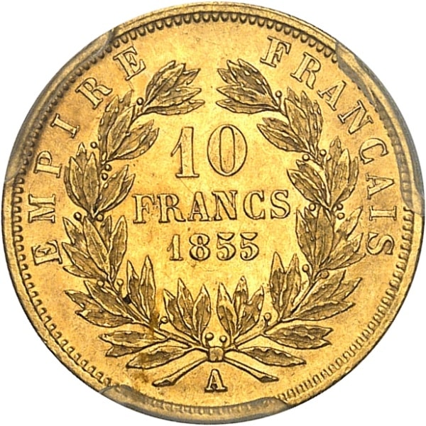 - Second Empire / Napoléon III (1852-1870). 10 francs tête nue, petit module, tranche cannelée 1855, A, Paris.