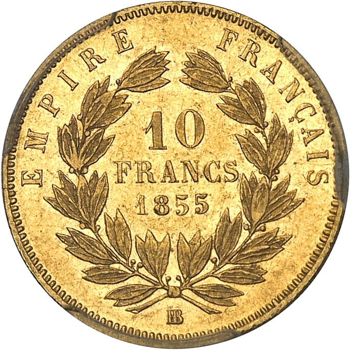 - Second Empire / Napoléon III (1852-1870). 10 francs tête nue grand module 1855, BB, Strasbourg.