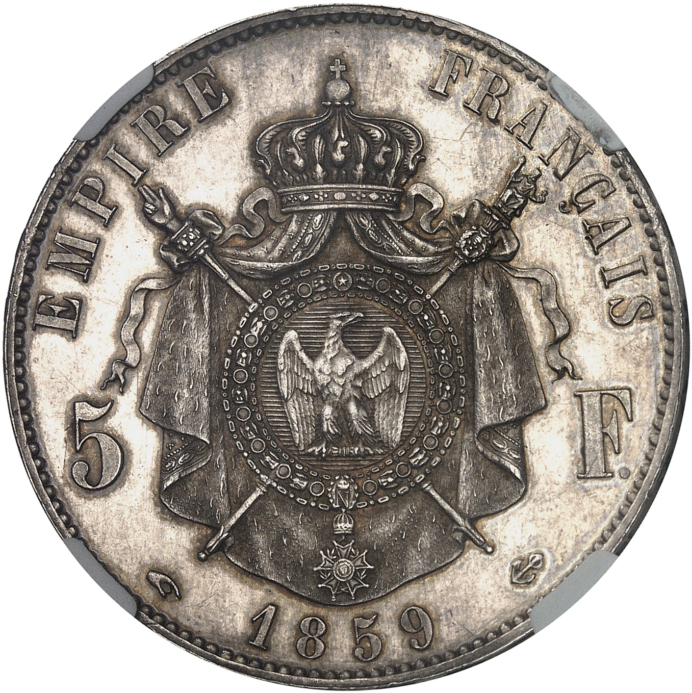 - Second Empire / Napoléon III (1852-1870). 5 francs tête nue 1859, A, Paris.