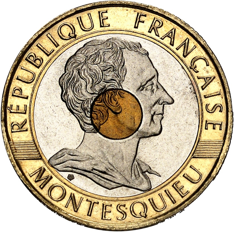 - Ve République (1958 à nos jours). Essai de flan trimétallique au module de 10 francs “Montesquieu” et au balancier ND (c.1996), Pessac.