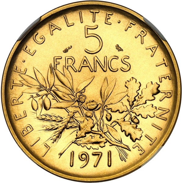 - Ve République (1958 à nos jours). Piéfort de 5 francs Semeuse en or, Flan bruni (PROOF) 1971, Paris.