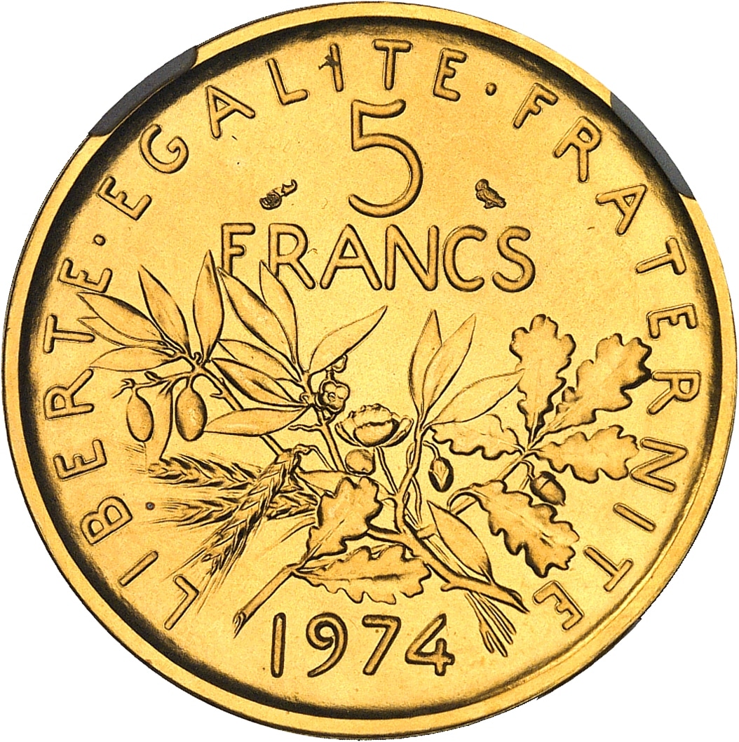 - Ve République (1958 à nos jours). Piéfort de 5 francs Semeuse en or, Flan bruni (PROOF) 1974, Pessac.