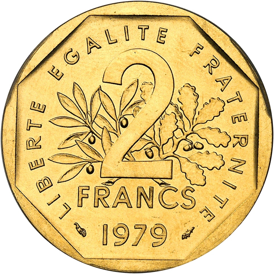 - Ve République (1958 à nos jours). Piéfort de 2 francs Semeuse en Or, Frappe spéciale (SP) 1979, Pessac.
