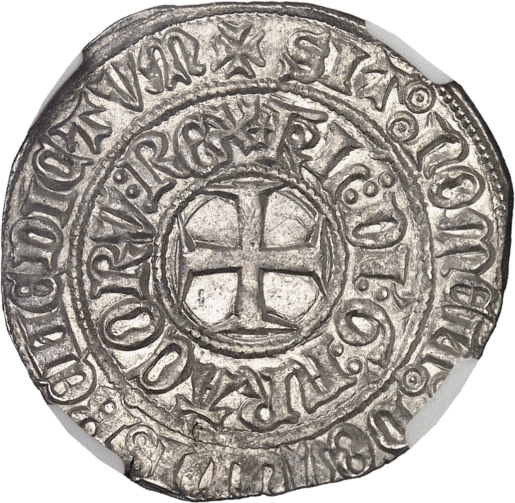 Rv. GROSVS: TVRONVS. Trois lis posés deux et un sous une couronne. Bordure extérieure d’une croisette et de onze lis dans des oves.