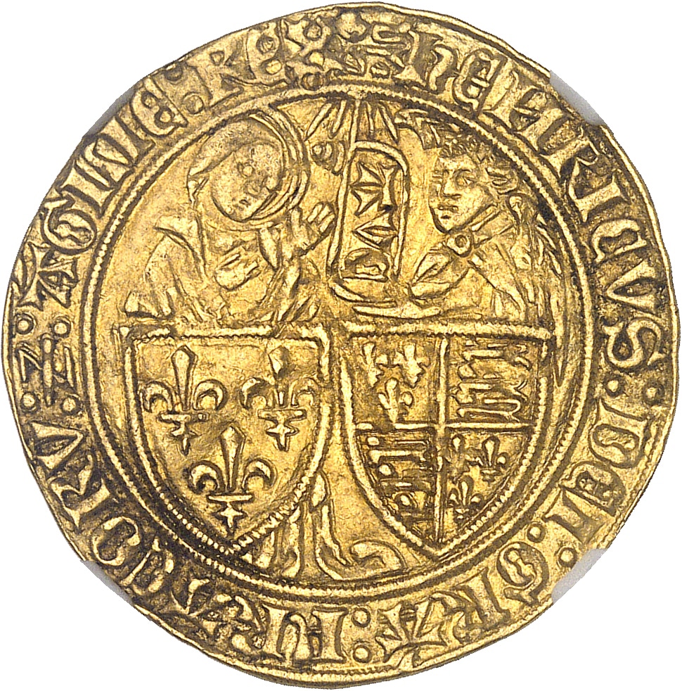 Av. (atelier) HENRICVS: DEI: GRA: FRACORV: Z: AGLIE: REX. L’archange Gabriel debout devant la Vierge Marie à qui il tend un parchemin portant le mot AVE, derrière les écus accotés de France-Angleterre ; au-dessus les rayons du soleil.