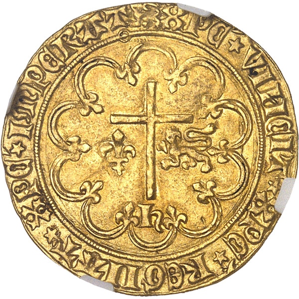 Rv. (atelier) XPC’* VINCIT’* XPC’* REGNAT’* XPC’* IMPERAT’*. Croix latine plaine accostée d’un lis et d’un léopard, sous laquelle est une H onciale, dans un polylobe fleurdelisé.