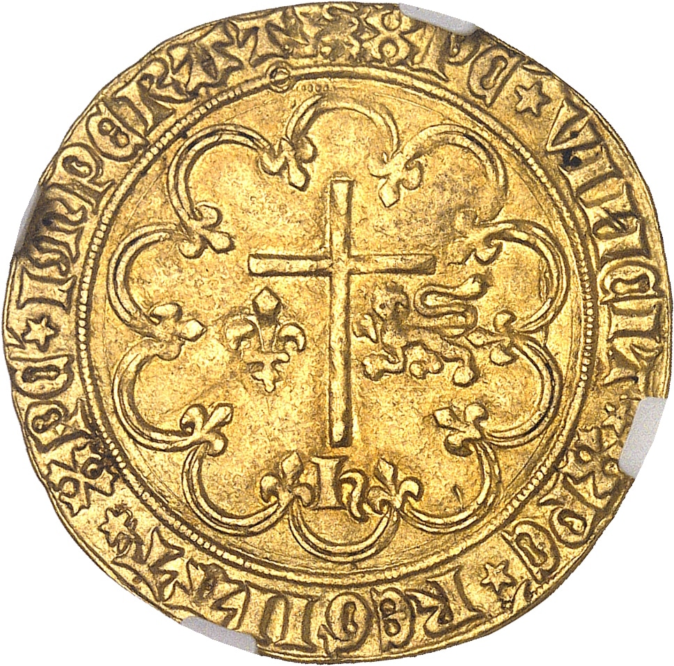 NGC AU 58 (6633221-002). Avec annelet pointé sous les dernières lettres des légendes, marque du maître Étienne Marcel (1433-1444). Le flan est à peine voilé, avec une usure régulière et une agréable patine dorée. Superbe.